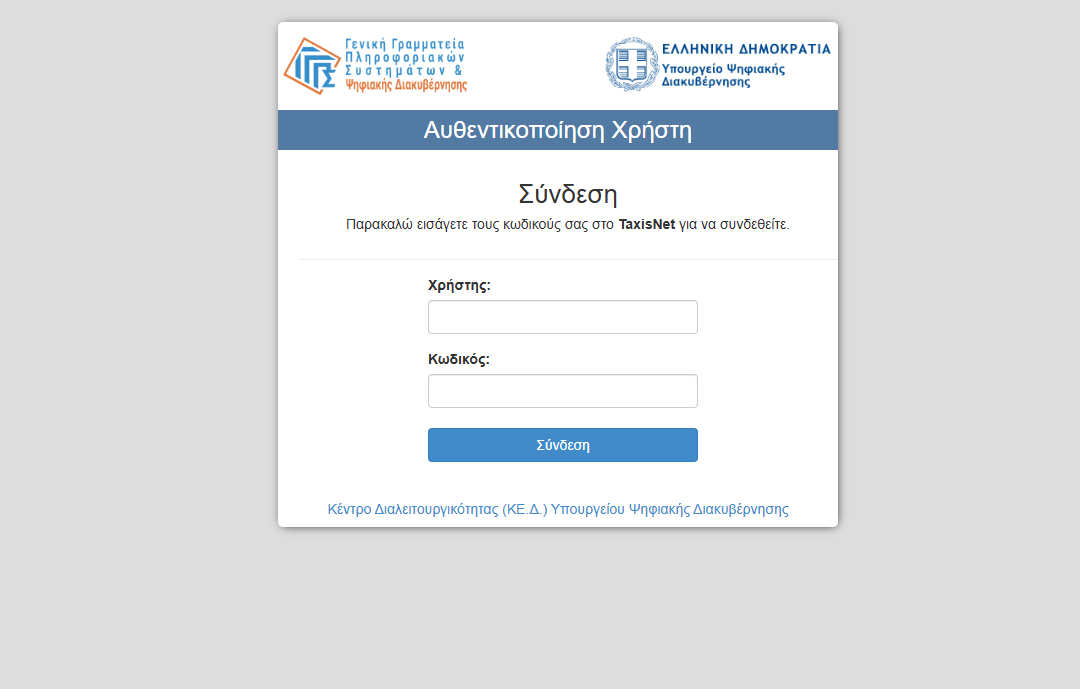 6. Βγαίνει η εικόνα αυθεντικοποίησης χρήστη, συμπληρώνουμε τα στοιχεία taxisnet και πατάμε Σύνδεση