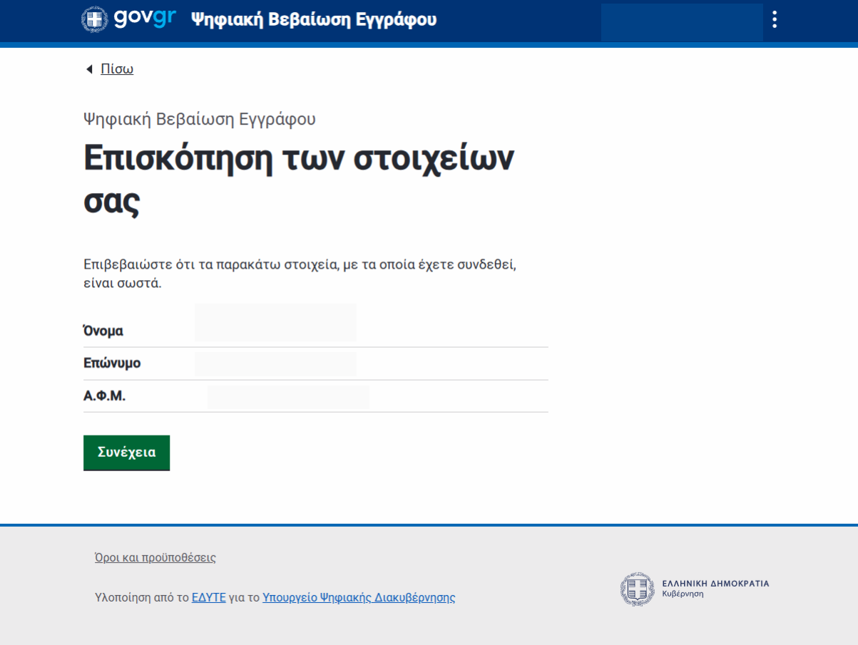 7.Βγαίνει η επισκόπηση των στοιχείων σας, βεβαιώνετε την ορθότητα τους και πατάτε συνέχει