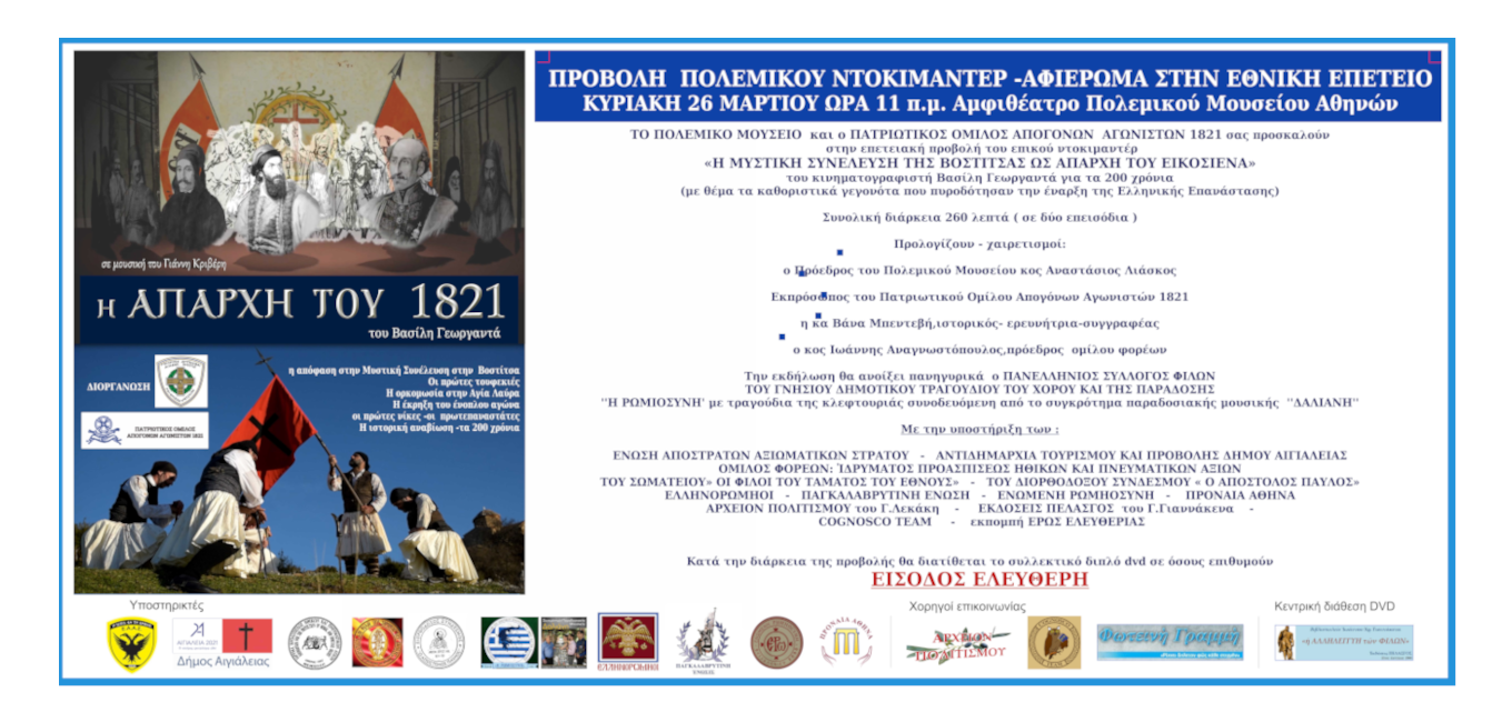 To Πολεμικό Μουσείο και ο Πατριωτικός Όμιλος Απογόνων Αγωνιστών 1821 σας προσκαλούν στην επετειακή προβολή του επικού ντοκιμαντέρ “Η ΜΥΣΤΙΚΗ ΣΥΝΕΛΕΥΣΗ ΤΗΣ ΒΟΣΤΙΤΣΑΣ ΩΣ ΑΠΑΡΧΗ ΤΟΥ ΕΙΚΟΣΙΕΝΑ” του Αιγιώτη κινηματογραφιστή Βασίλη Γεωργαντά για τα 200 χρόνια ( με θέμα τα καθοριστικά γεγονότα που πυροδότησαν την έναρξη της Ελληνικής Επανάστασης )