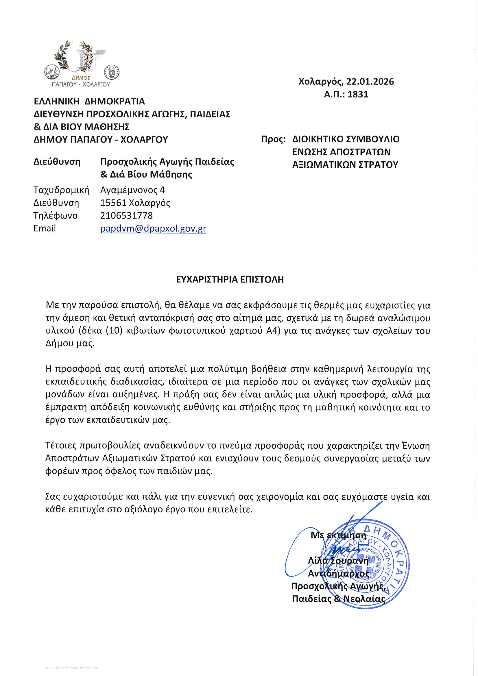 Ευχαριστήρια επιστολή Δήμου Παπάγου – Χολαργού