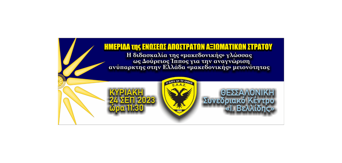 Σας γνωρίζουμε ότι, η Ένωση την Κυριακή 24 Σεπτεμβρίου και από 11:30 μέχρι 14:00, θα πραγματοποιήσει ημερίδα στο Συνεδριακό Κέντρο «Ιωάννης Βελλίδης» στη Θεσσαλονίκη, με θέμα «Η διδασκαλία «μακεδονικής» γλώσσας, ως Δούρειος Ίππος για την αναγνώριση ανύπαρκτης «μακεδονικής» μειονότητας, στην Ελλάδα».