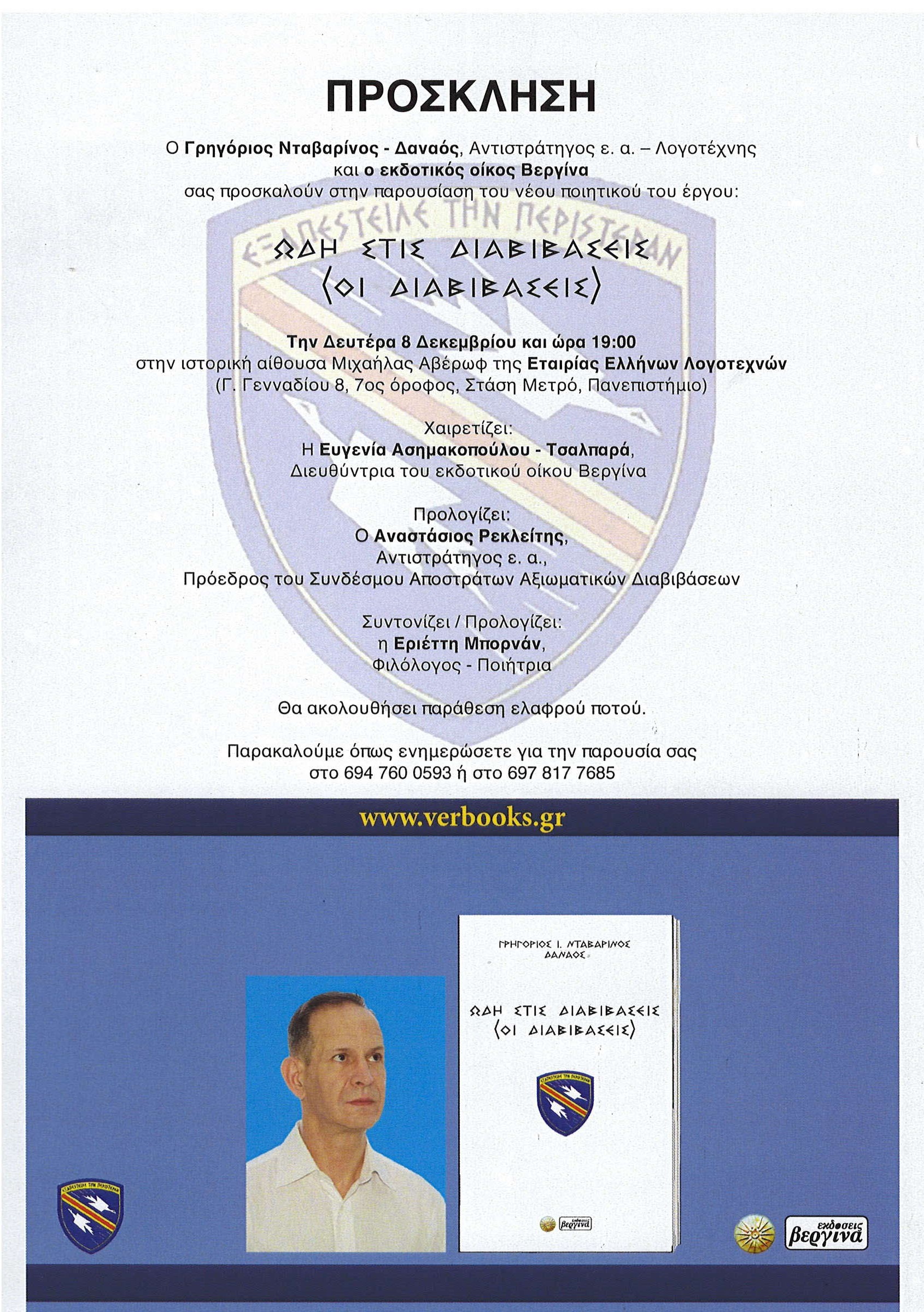 Ημερομηνία Ανακοίνωσης 03 Δεκ, 2025 Ο Γρηγόριος ΝταβαρΊνος - Δαναός Αντγος ε.α - Λογοτέχνης και ο εκδοτικός οίκος Βεργίνα σας προσκαλούν στην παρουσίαση του νέου ποιητικού του έργου «ΩΔΗ ΣΤΙΣ ΔΙΑΒΙΒΑΣΕΙΣ».