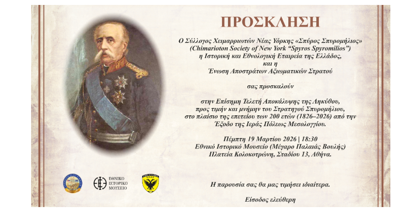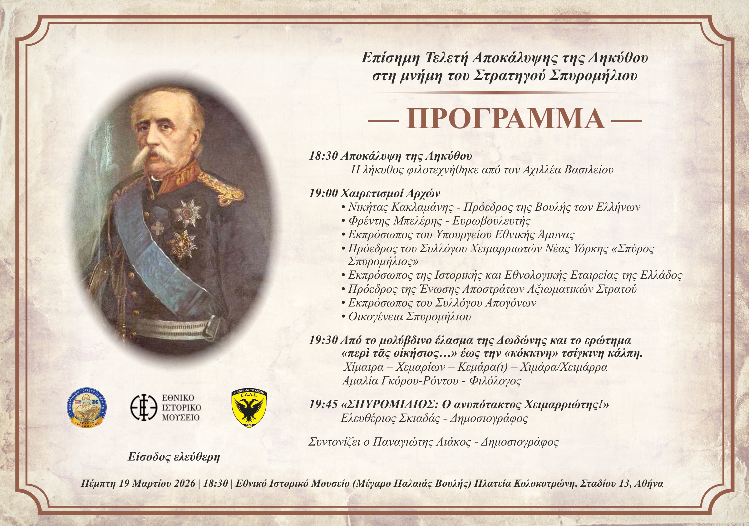 Η ΕΑΑΣ πιστή στους ιδρυτικούς της σκοπούς και με στόχο την διατήρηση αμείωτου του Εθνικού φρονήματος και της ιστορικής μνήμης συνδιοργανώνει με το Εθνικό Ιστορικό Μουσείο την τοποθέτηση και αποκάλυψη της Ληκύθου που θα περιέχει την καρδιά του Στγου Σπυρομήλιου την 19η Μαρτίου 2026, στις 18:30 στο κτίριο της Παλαιάς Βουλής (Κολοκοτρώνη 3).