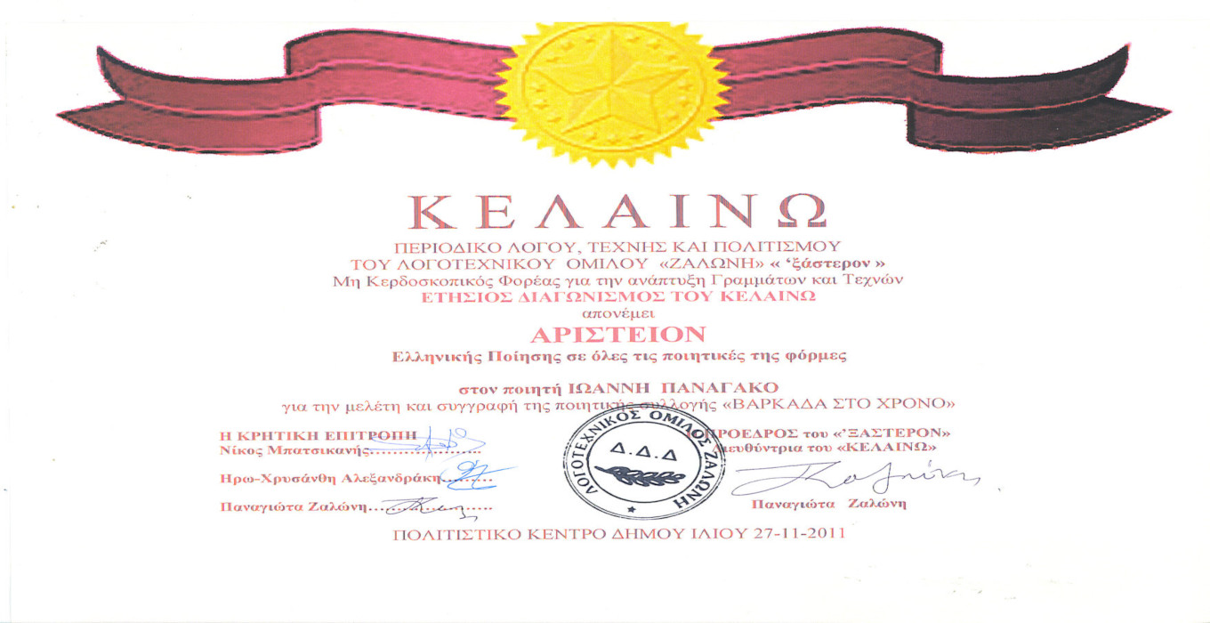 Από την Ποιητική Συλλογή "Βαρκάδα στο Χρόνο" - Αριστείο μετά χρυσού μεταλλίου στον Διεθνή Λογοτεχνικό Διαγωνισμό Ποίησης του Λογοτεχνικού Περιοδικού «ΚΕΛΑΙΝΩ» του Λογοτεχνικού Ομίλου «ΖΑΛΩΝΗ - Ξάστε-ρον».
