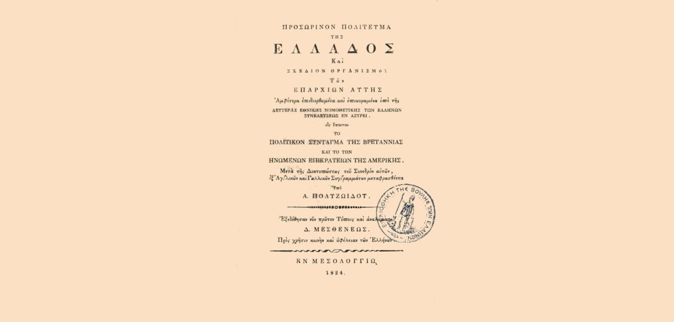 Τον θεμέλιο λίθο των ουσιωδών διατάξεων του ελληνικού Συντάγματος έθεσε κατά τον 18ο αιώνα ο εθνομάρτυρας Ρήγας Φεραίος {Βελεστινλής}. Στο μεγαλόπνοο έργο του “Νέα Πολιτική Διοίκηση……” περιέλαβε διατάξεις περί κυριαρχίας του λαού, πολιτικής ισότητας, ατομικών και κοινωνικών δικαιωμάτων. Διατάξεις, οι οποίες αποτυπώθηκαν όπως περιέχονταν στην “Διακήρυξη Δικαιωμάτων του Ανθρώπου”, κατά τις οποίες ρητά και με σαφήνεια καθορίζονταν ότι “η εγγύηση των δικαιωμάτων του ανθρώπου κατασφαλίζεται και η διάκριση των εξουσιών προσδιορίζεται με το Σύνταγμα κάθε χώρας” {άρθρο 16}.