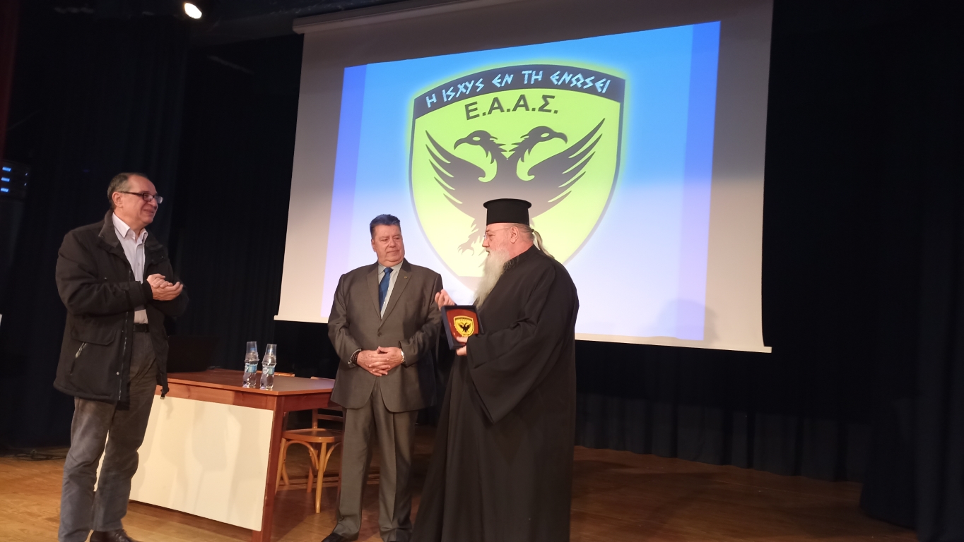 Το Σάββατο 14 Φεβρουαρίου στην αίθουσα πολλαπλών χρήσεων της πόλεως, απονεμήθηκε από τον Πρόεδρο της Ε.Α.Α.Σ. Υπτγο ε.α. Δεβούρο Ιωάννη τιμητική πλακέτα στο Δήμαρχο Φλώρινας κ. Γιαννάκη Βασίλειο για την Ελληνοπρεπή και πατριωτική στάση που επέδειξε σε πρόσφατο μουσικό φεστιβάλ απαγορεύοντας την ερμηνεία τραγουδιών στην ανύπαρκτη Μακεδονική γλώσσα, με αλυτρωτικό - ανθελληνικό περιεχόμενο. Επίσης από το μέλος Δ.Σ/Ε.Α.Α.Σ. Σχη ε.α. Μακρή Γεώργιο απονεμήθηκε τιμητική πλακέτα στο μέλος Ανχη ε.α. Γκερτσάκη Αναστάσιο (νυν Ιερέα) για την σθεναρή και εθνική του στάση κατά την τελετή υπογραφής της Συμφωνία των Πρεσπών.